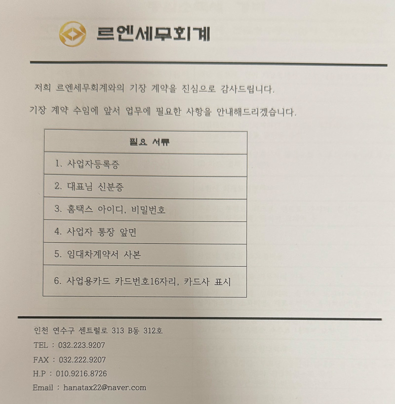 개인적으로 세무사 판단 기준은 친절하고 꼼꼼한 업무 처리라 생각하기 때문에 이번에 변경한 세무사가 정말 마음에 들어 이번 글을 작성하게 되었고, 초기 서류 제공도 간략해 만족도가 높습니다.