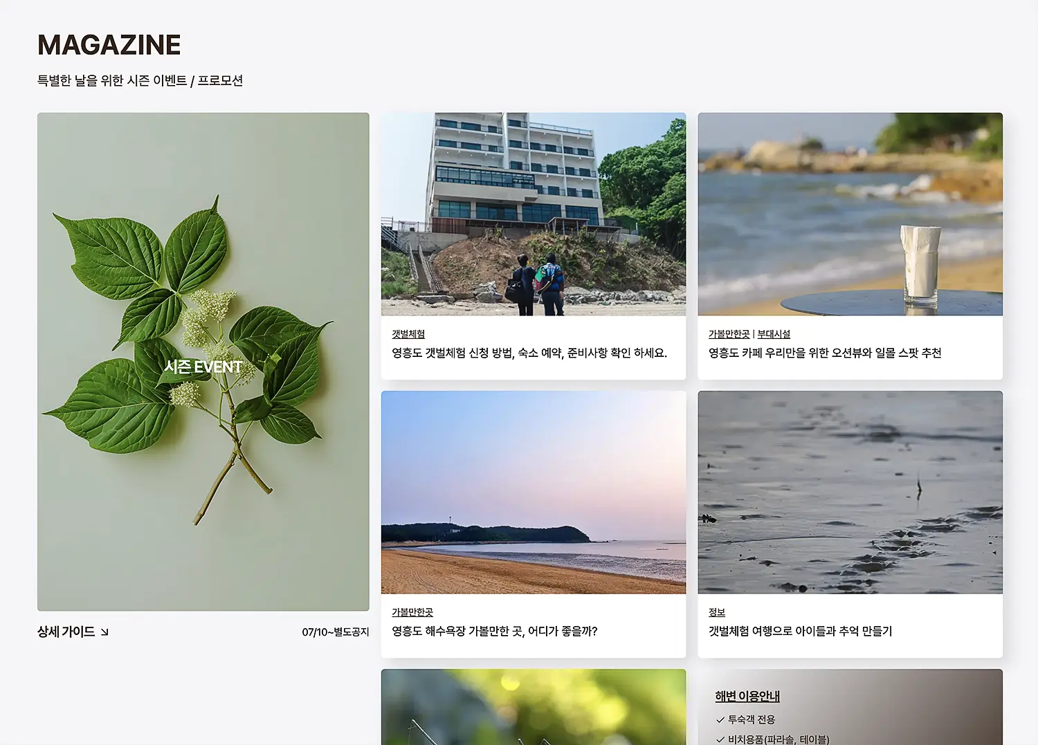 이후 각 페이지 디자인 별로 SEO 요소를 적용해 조화를 이루고, 클라이언트가 원하는 기능까지 추가해 현재(2025년 8월 15일 기준) 네이버 검색 결과에서 “영흥도+호텔, 영흥도+리조트” 상위에 노출되고 있습니다.